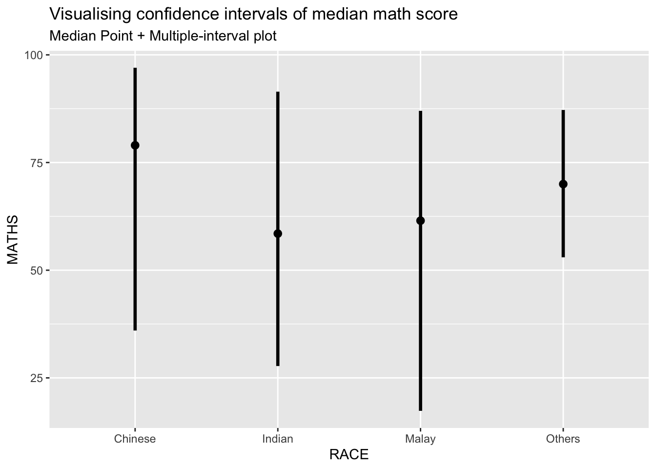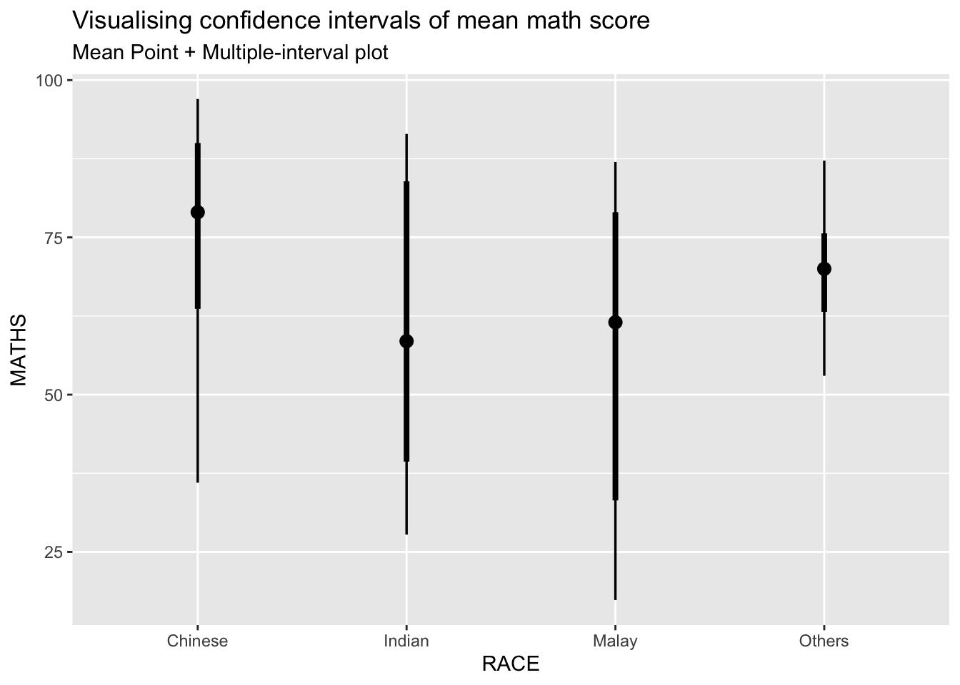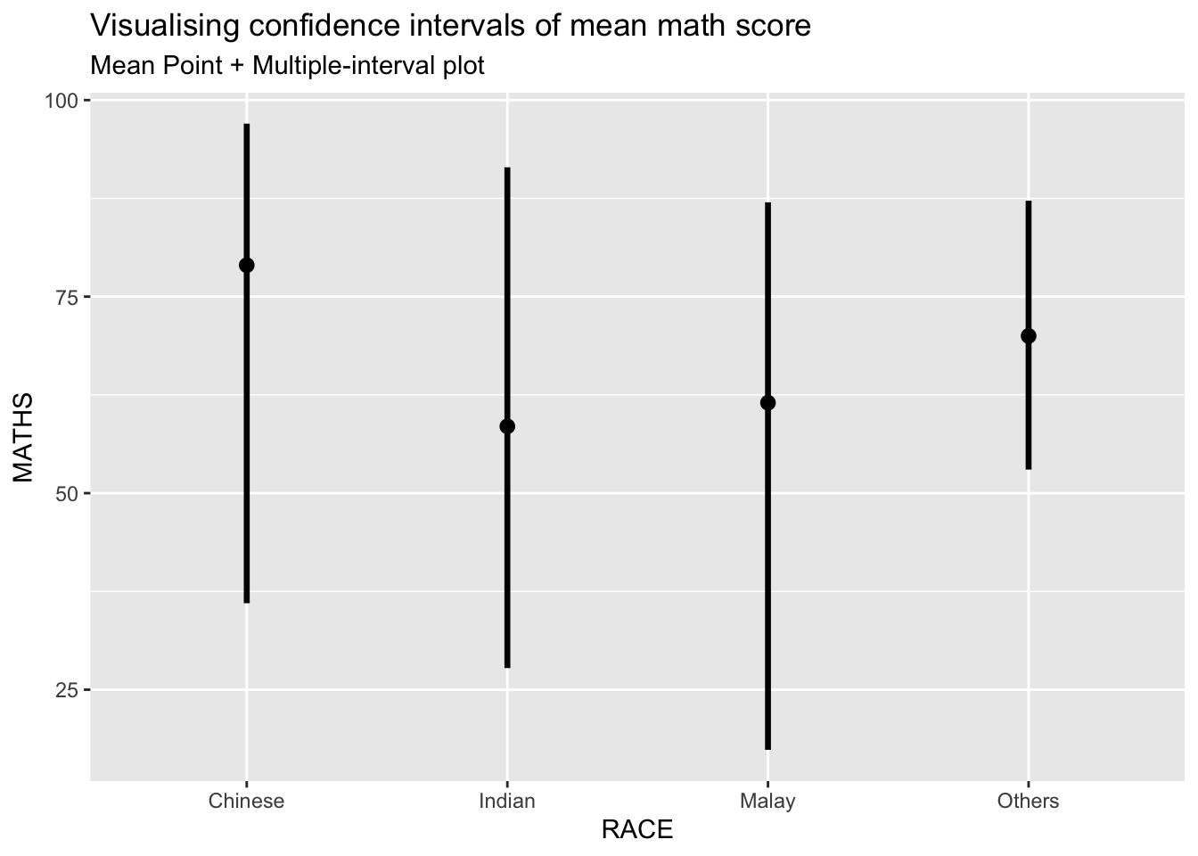 In this section, you will learn how to plot error bars of maths scores by race by using data provided in exam tibble data frame.