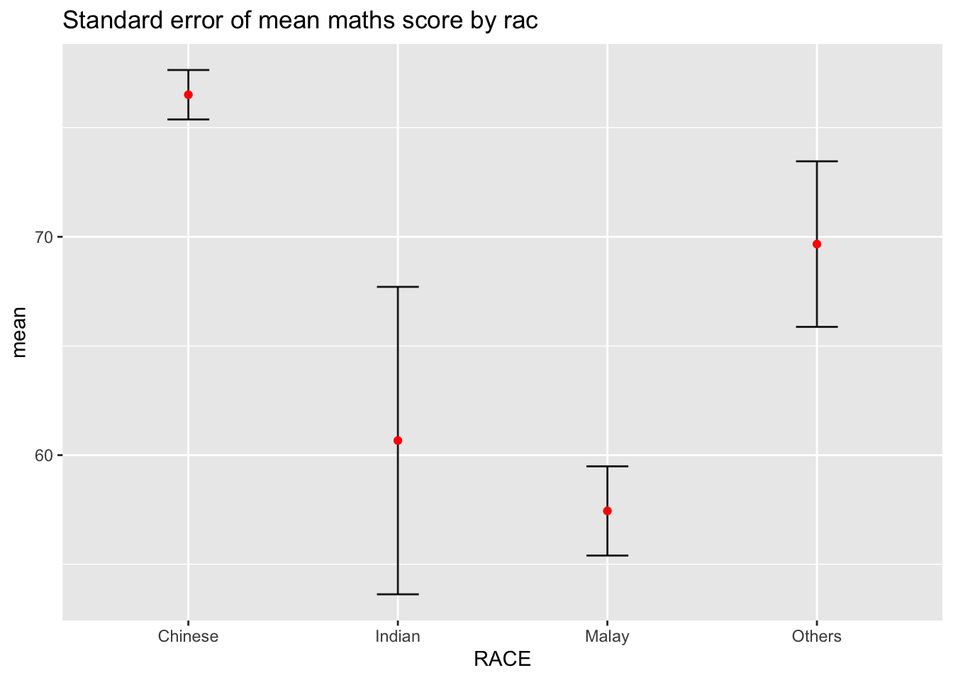 Now we are ready to plot the standard error bars of mean maths score by race as shown below.