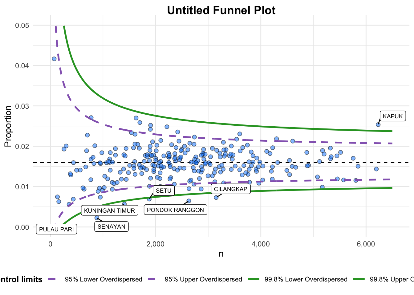 limit: plot limits (95 or 99).label_outliers: to label outliers (true or false).Poisson_limits: to add Poisson limits to the plot.OD_adjust: to add overdispersed limits to the plot.xrangeandyrange: to specify the range to display for axes, acts like a zoom function.Other aesthetic components such as graph title, axis labels etc.