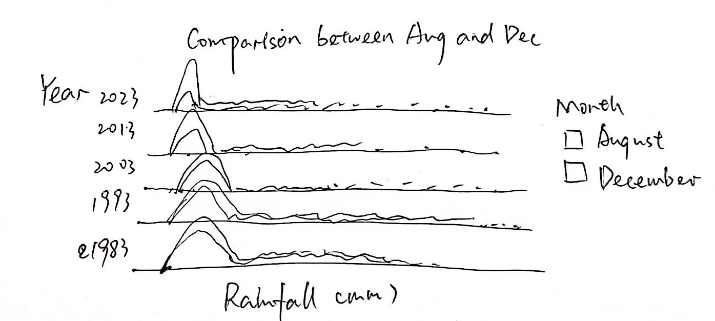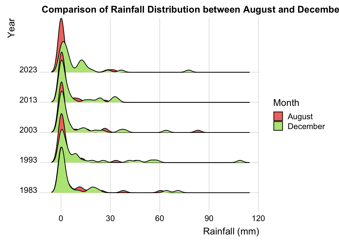 Trend Over the Years: In the earlier years (such as 1983 and 1993), the density distribution peaks of rainfall in August and December were relatively close; however, in later years (like 2013 and 2023), the difference between the two months seems to be more pronounced.
