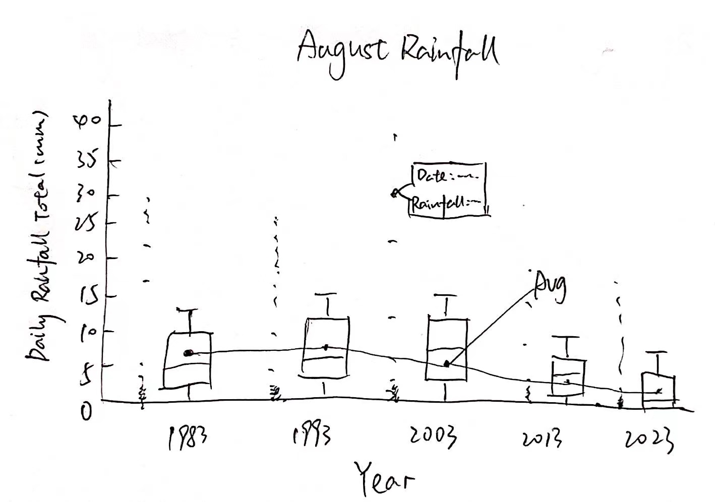 The light blue box plots and salmon scatter plots represent the precipitation data for August. When hovering over a point, you can see the corresponding date and the total daily precipitation. When hovering over a point on the line graph, you will see the year and the average precipitation for August of that year.
