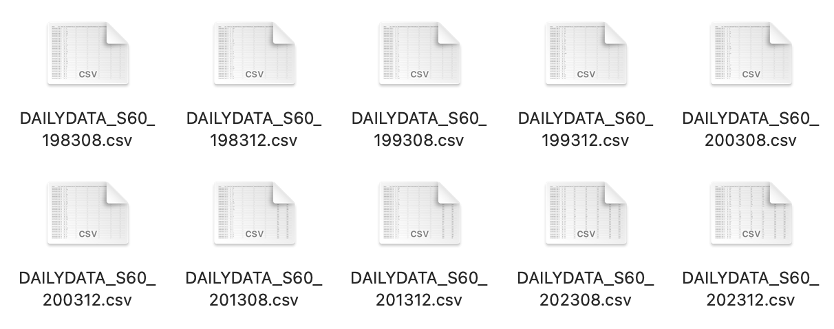 data10 <- data10 %>% select(Year, Month, Day, `Daily Rainfall Total (mm)`)file_names <- c("DAILYDATA_S60_198308.csv", "DAILYDATA_S60_199308.csv", "DAILYDATA_S60_200308.csv","DAILYDATA_S60_201308.csv", "DAILYDATA_S60_202308.csv", "DAILYDATA_S60_198312.csv","DAILYDATA_S60_199312.csv", "DAILYDATA_S60_200312.csv", "DAILYDATA_S60_201312.csv","DAILYDATA_S60_202312.csv")